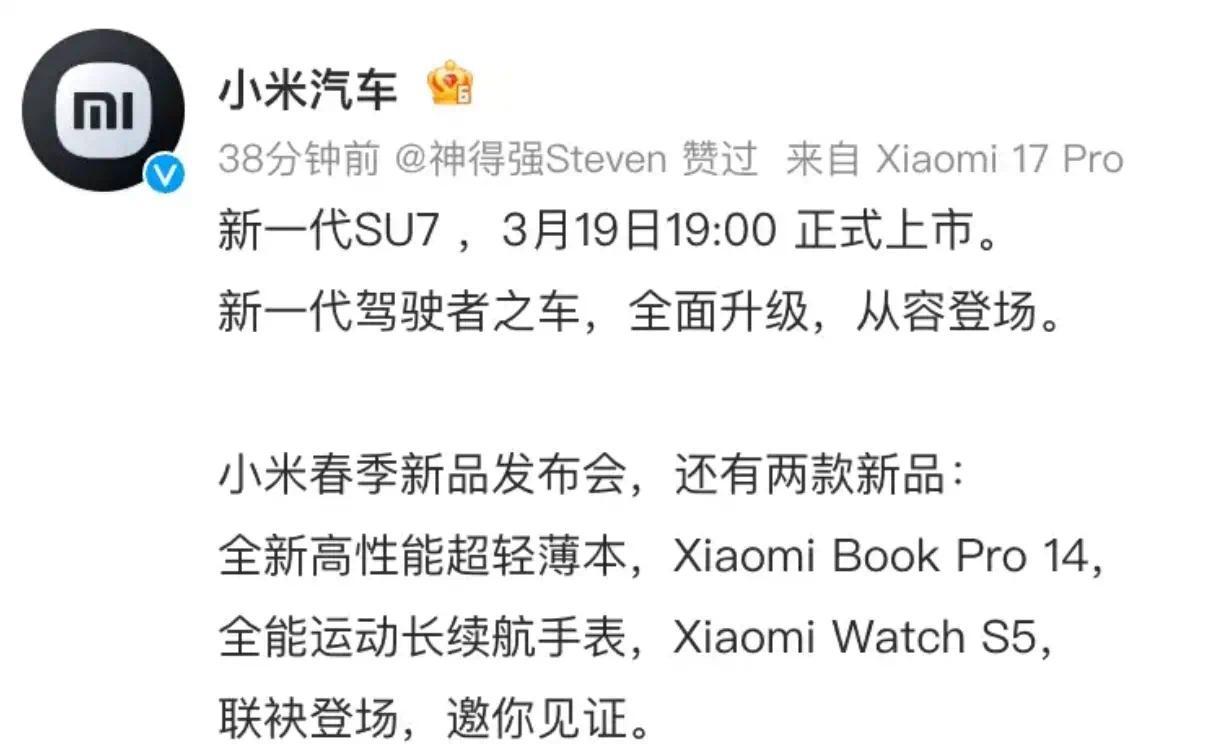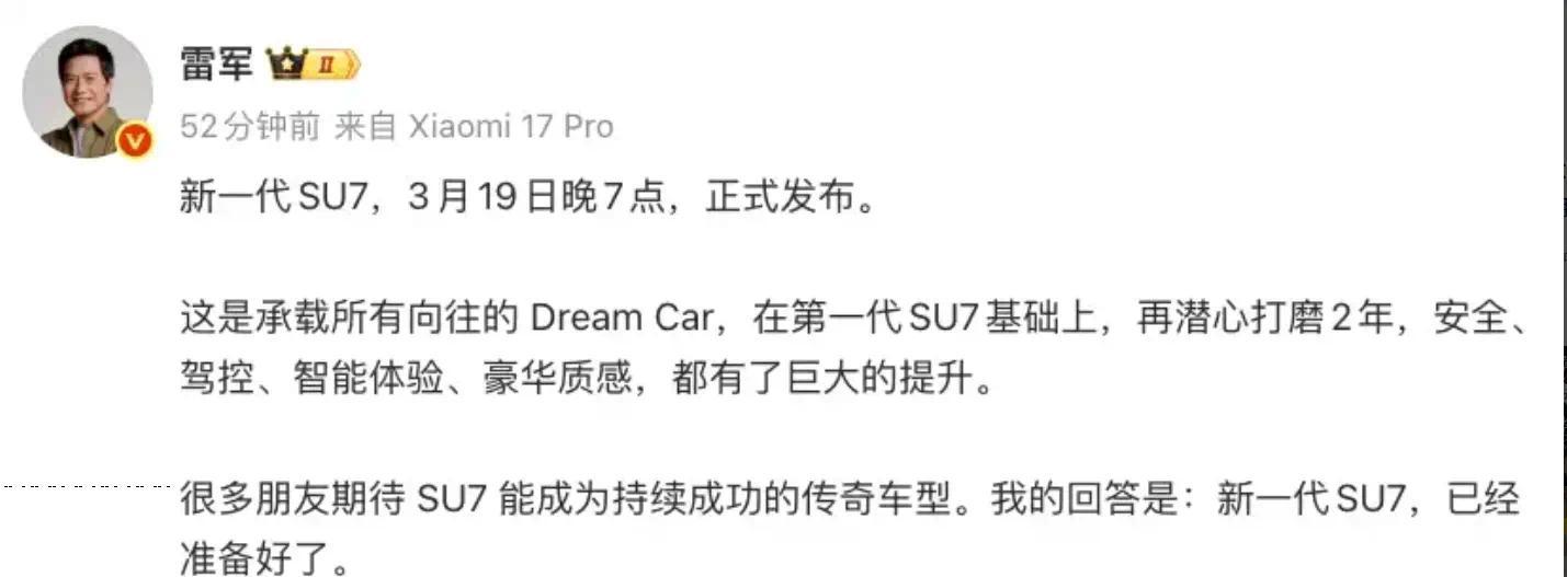 日前,小米汽车官方发布预告,新款SU7将于3月19日上市,雷军表示:“新车潜心打磨2年,将在安全、驾控、智能体验、豪华质感有巨大的提升。很多朋友期待SU7能成为持续成功的传奇车型。我的回答是:新款SU7,已经准备好了。”