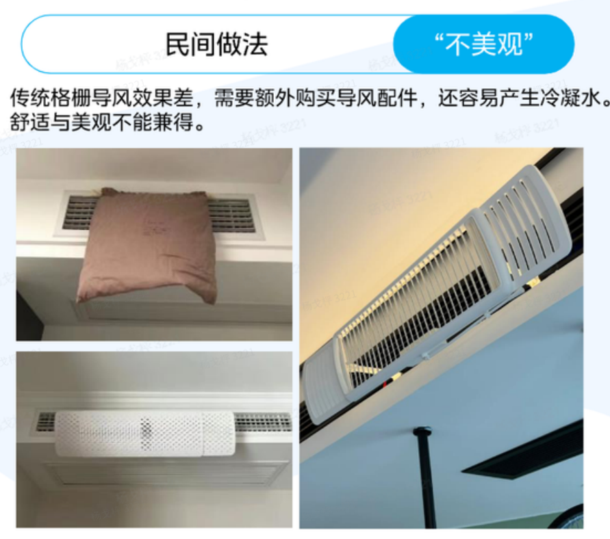 第二种做法,是自己买各种导风栅栏。效果不一定好,还会滴一地的冷凝水。