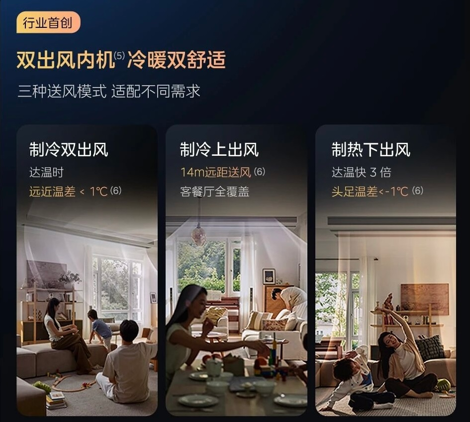 制冷时,则让冷风“滑翔”。向上发射,让冷风贴着天花板水平飞出去,能像天幕一样飞到十几米远,避开沙发上的人,直接覆盖全屋,再缓缓落下。